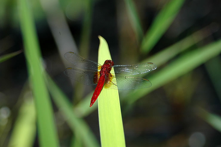 鮮やかな赤のトンボが水面を飛び回ってた。