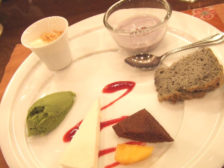 抹茶アイス、ココナッツのアイス、チョコフィナンシェ、ごまのケーキ、