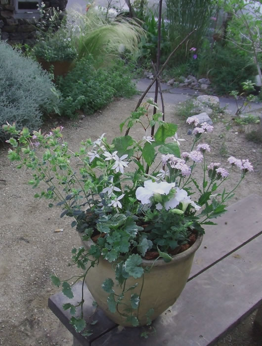 白いイソトマ、ペチュニア、淡い紫のバーベナの小花種、