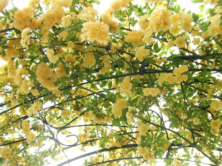 窓越し、庭のアーチの木香薔薇が本当に綺麗に咲いていて